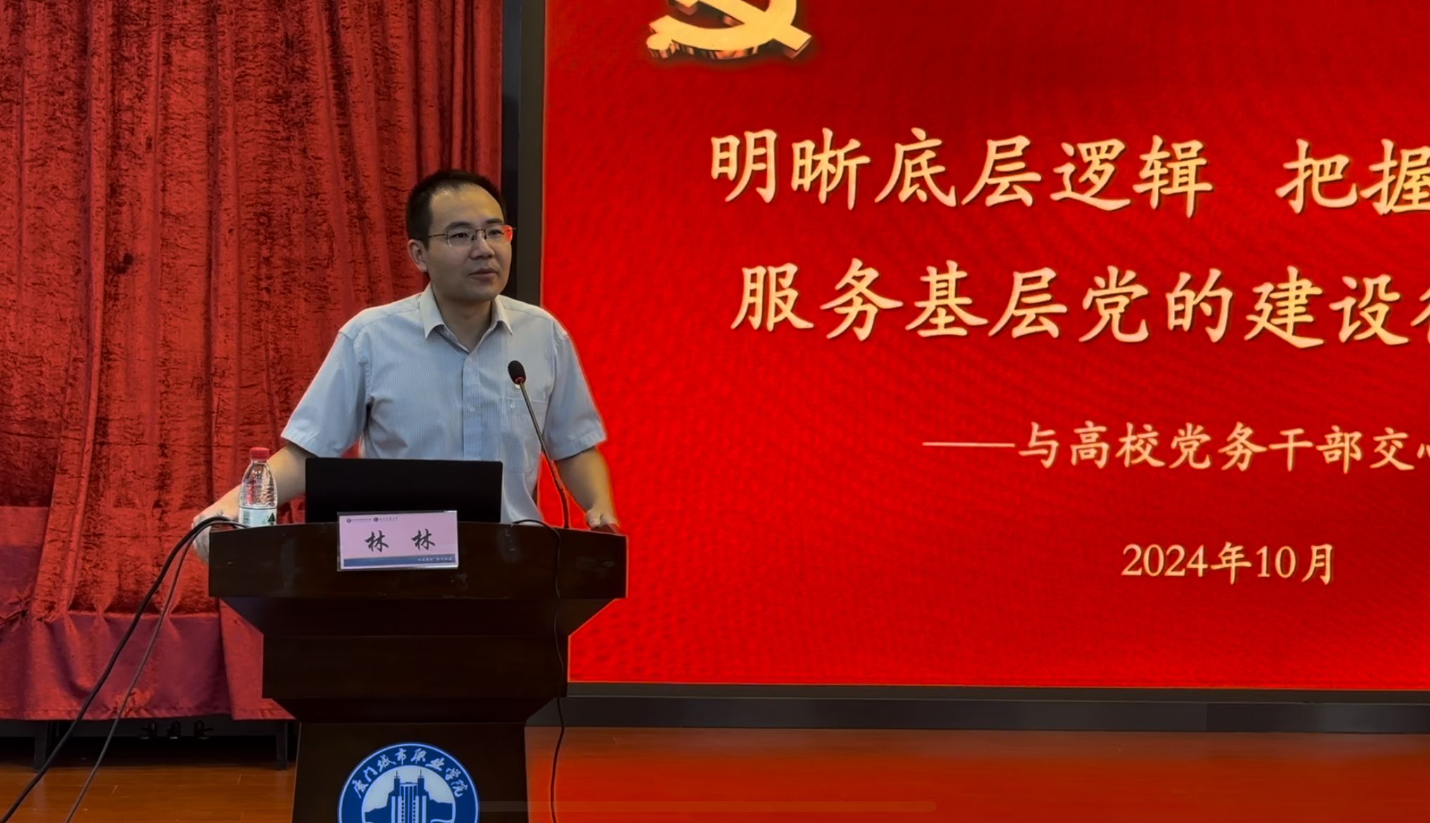 厦门城市党建学院讲师、思明区委直属机关党建指导员林林作题为《明晰底层逻辑把握履责要点服务基层党的建设行健向优——与高校党务干部交心交谈》的专 题讲座。他从党建工作的目标使命、职责定位、工作重心等方面梳理了基层党建实 务的工作逻辑和流程,对党务工作者应具备的基本素养能力进行了阐释。